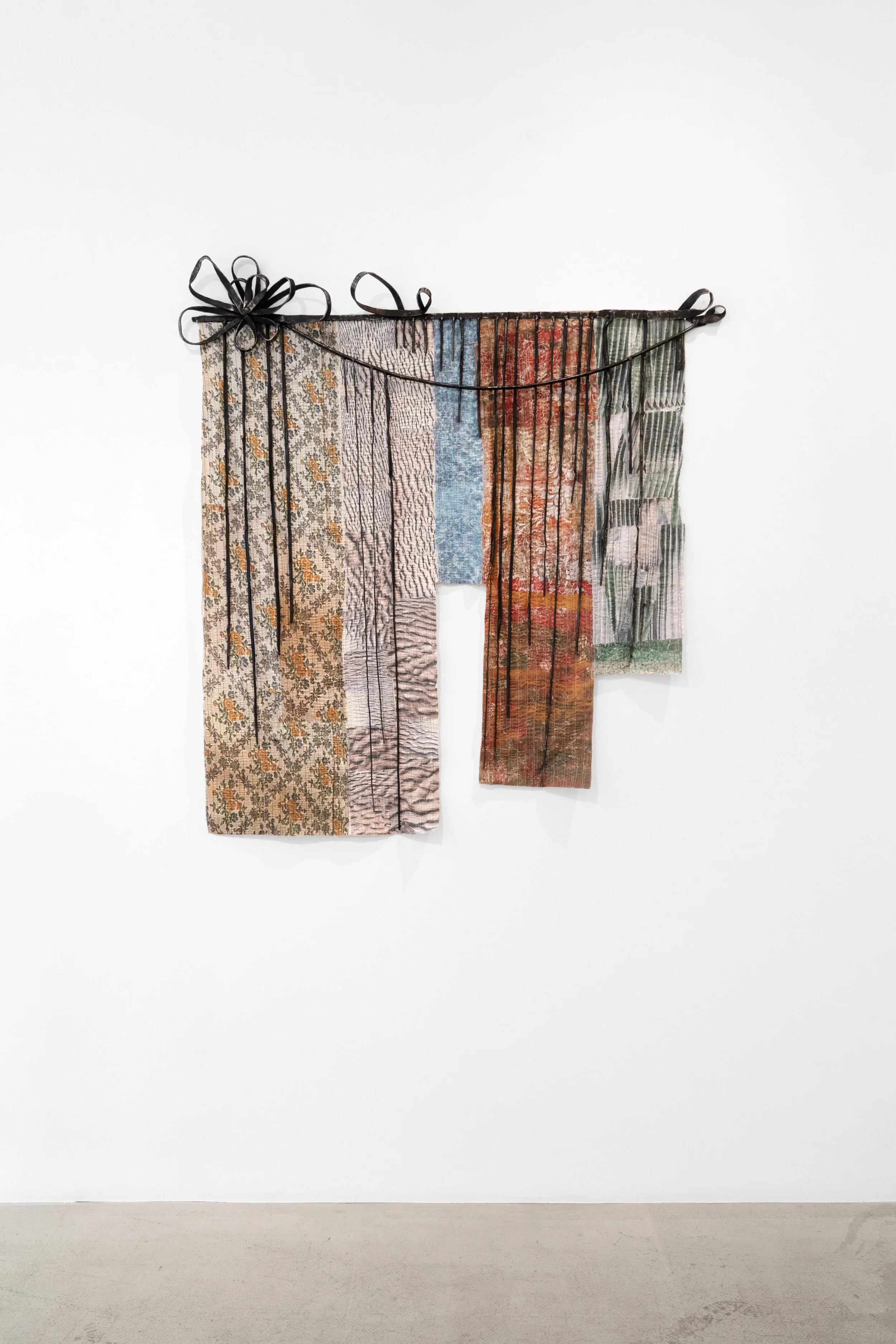 Tisseur au mètre #2 , 2025 / Impressions digitales sur tissus, broderies, acier forgé et patiné en noir / 115 x 115 x 5 cm / Crédits Photos : Hélène Janicot